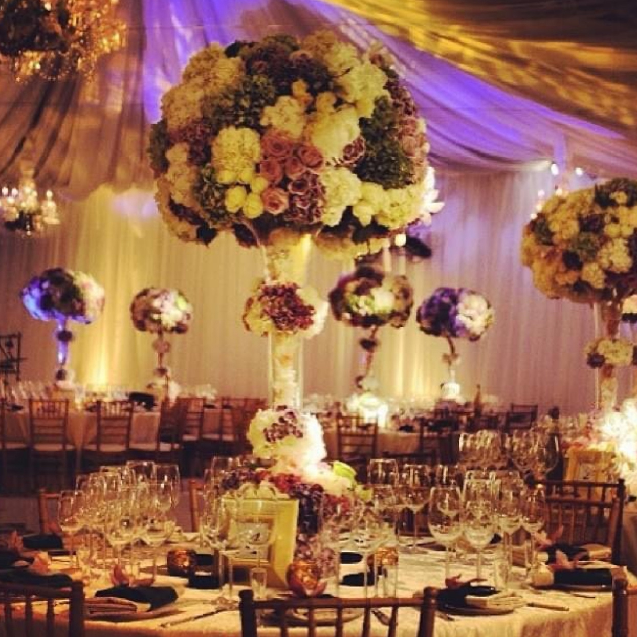 Inside, a fully draped ballroom awaits, adorned with white sheers and illuminated by 4 magnificent Maria Theresa crystal chandeliers. Uplights cast a magical glow, allowing you to customize the ambiance with a spectrum of colors.